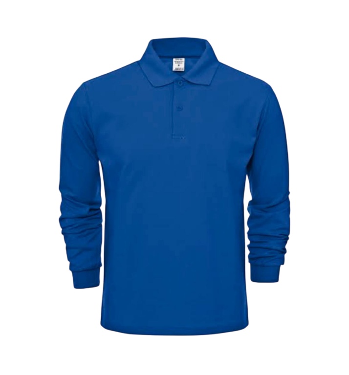 Uzun kollu polo yaka tişört: mavi renkli olup, herhangi bir arma, model, resim, desen içermez.
